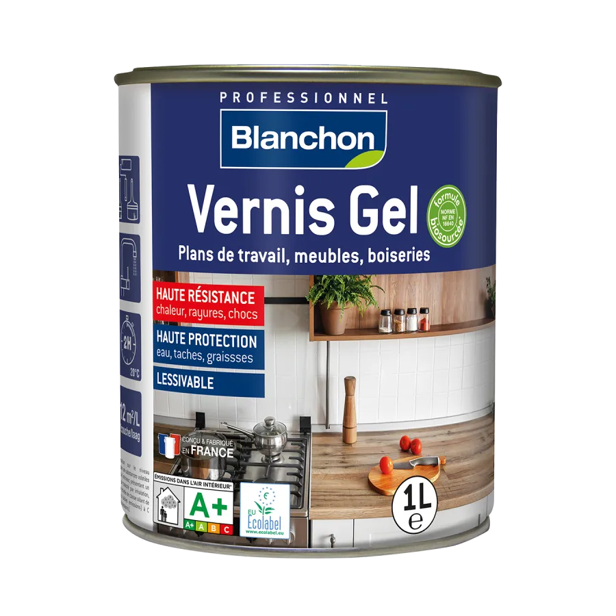 Blanchon gel-vernis-was kleurloos 1 L is een hoogwaardige gelvernis voor binnenshuis, bestaande uit 77% natuurlijke, biogebaseerde en minerale ingrediënten, waaronder 24% biogebaseerde koolstof volgens NF EN 16640. Geschikt voor werkbladen, meubels en houtwerk van alle houtsoorten. Dankzij de niet-druipende geltextuur is de vernis eenvoudig aan te brengen op verticale oppervlakken en levert hij een egaal, professioneel resultaat. De aqua-polyurethaanharsen bieden sterke bescherming tegen hitte tot 100°C, water, vlekken, vet, krassen en stoten. De kleurloze gel-vernis-was behoudt de natuurlijke uitstraling van het hout en is uitspoelbaar en bestand tegen afwassen en huishoudelijke schoonmaakmiddelen, ideaal voor intensief dagelijks gebruik.