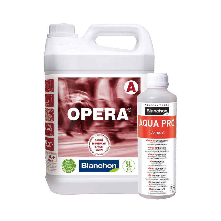 Blanchon OPERA® 2K kleurloos mat 5 L is een biogebaseerde tweecomponenten parketlak op polyurethaanbasis, met 71% natuurlijke, biogebaseerde en minerale ingrediënten, waaronder 23% biogebaseerde koolstof (NF EN 16640). Deze lak biedt uitzonderlijke prestaties voor intensief gebruikte openbare ruimten. OPERA® combineert maximale slijtweerstand met hoge schokbestendigheid en uitstekende chemische bestendigheid (NF EN 13442). Geschikt voor alle houtsoorten, met eenvoudig aanbrengen, hoog dekkend vermogen en een afwerking die de natuurlijke warmte en nerven van het hout benadrukt.